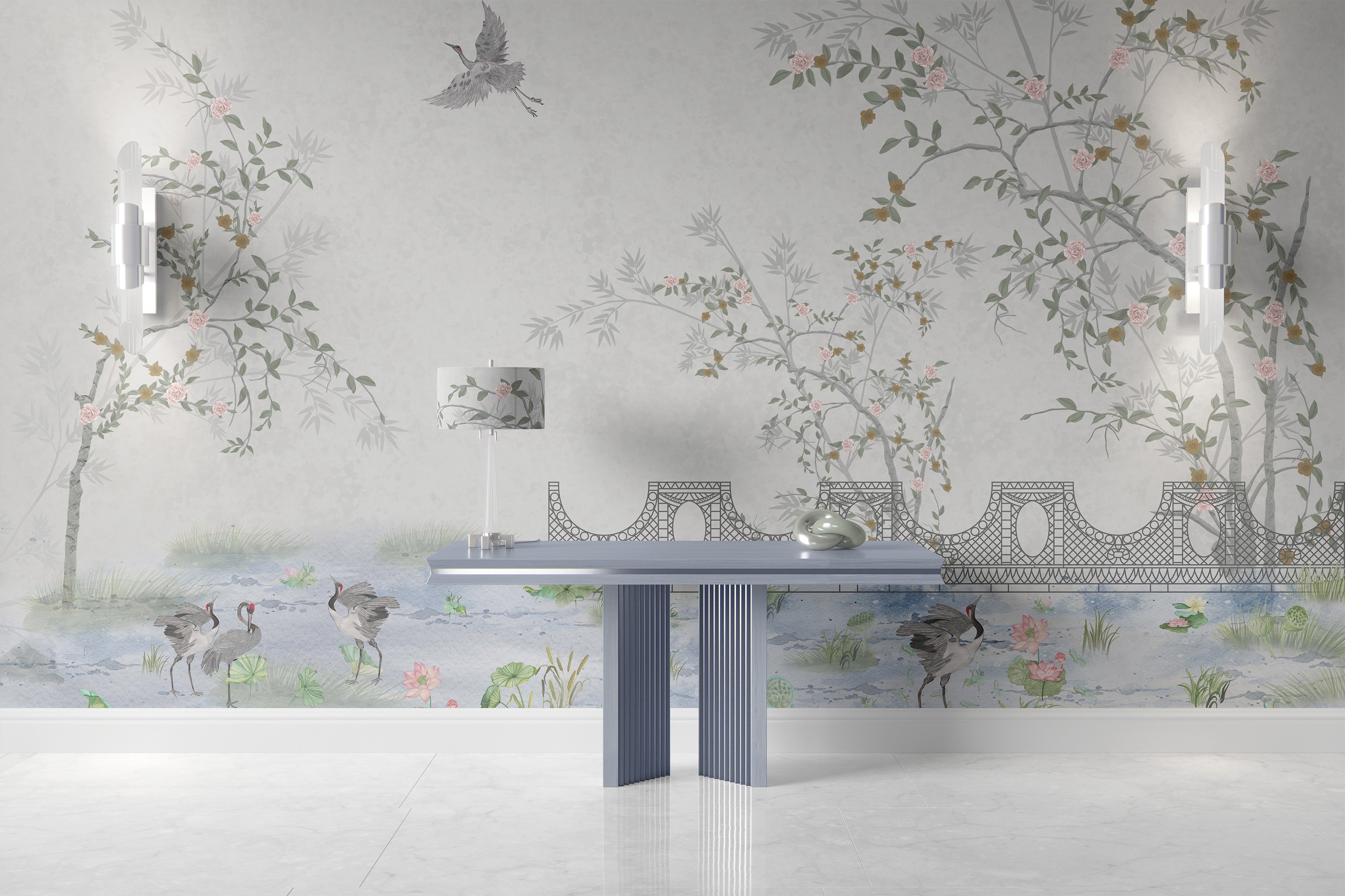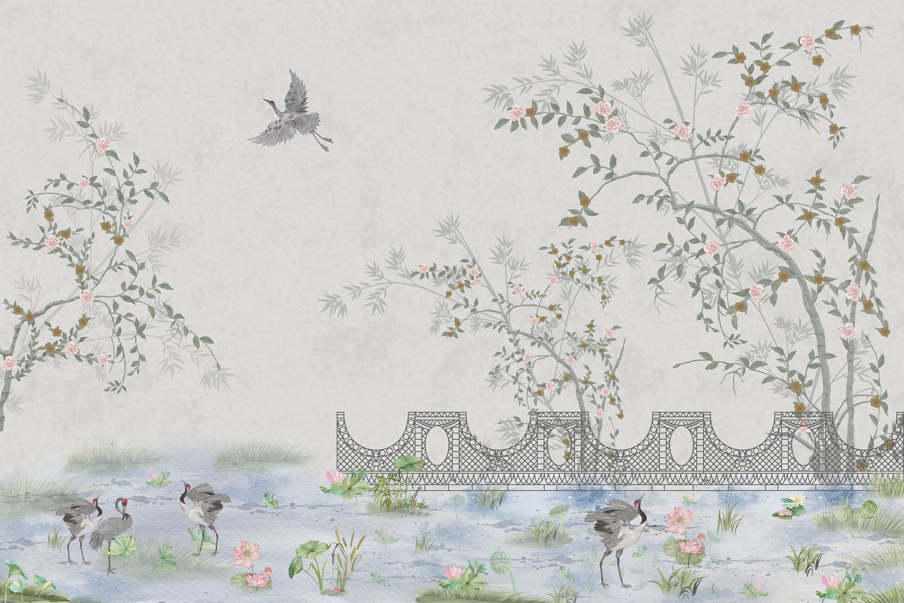 Delicate cranes glide across misty waters as soft blossoms unfold in painterly elegance. A tribute to Chinoiserie charm, this serene scape invites quiet reflection and transforms your walls into a tranquil sanctuary of grace.