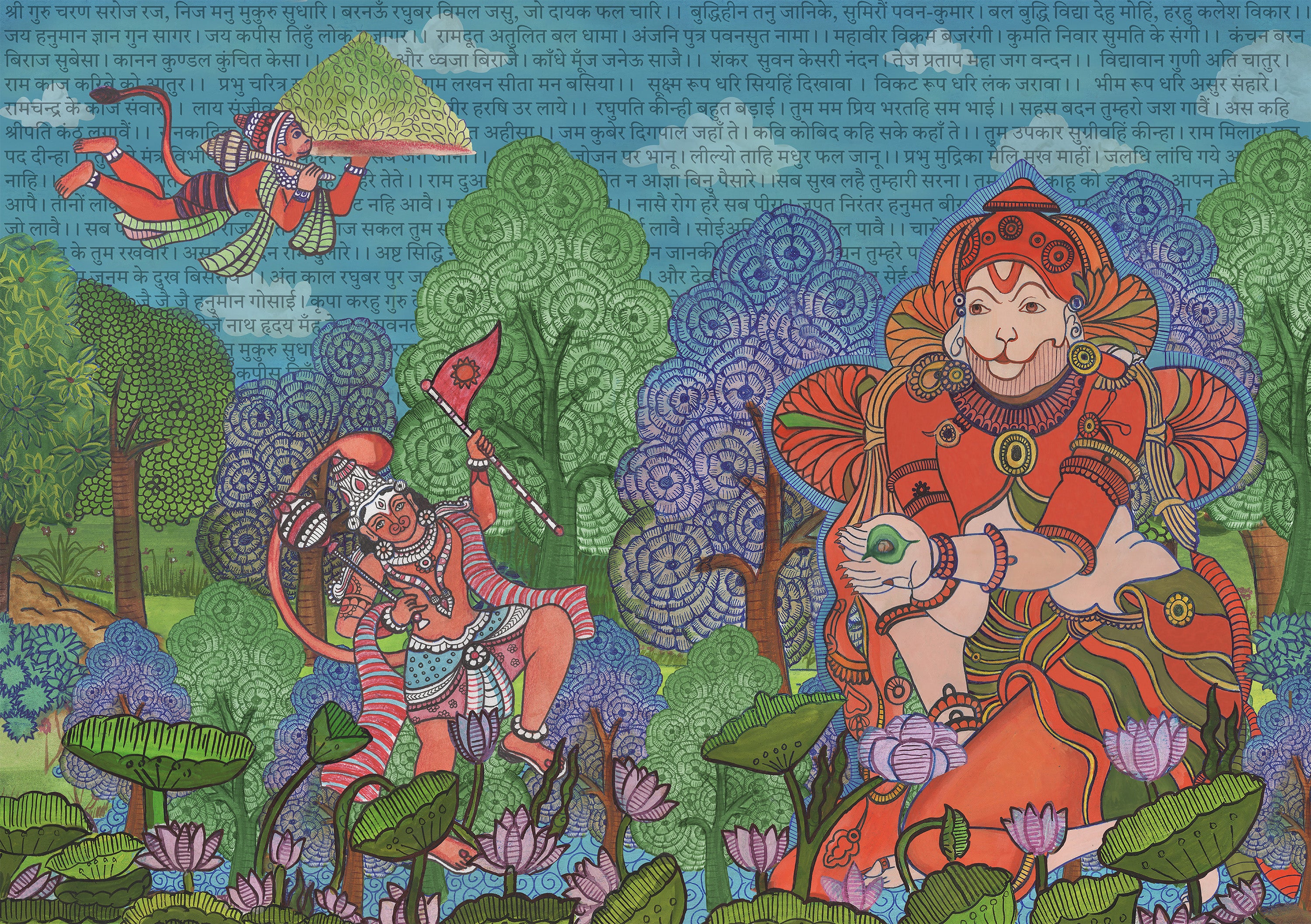 A celestial tribute to Hanuman ji, where sacred verses soar across skies and divine strength takes flight. Lotus blooms and mythic brushstrokes come together in a visual hymn bold, spiritual, and profoundly moving.