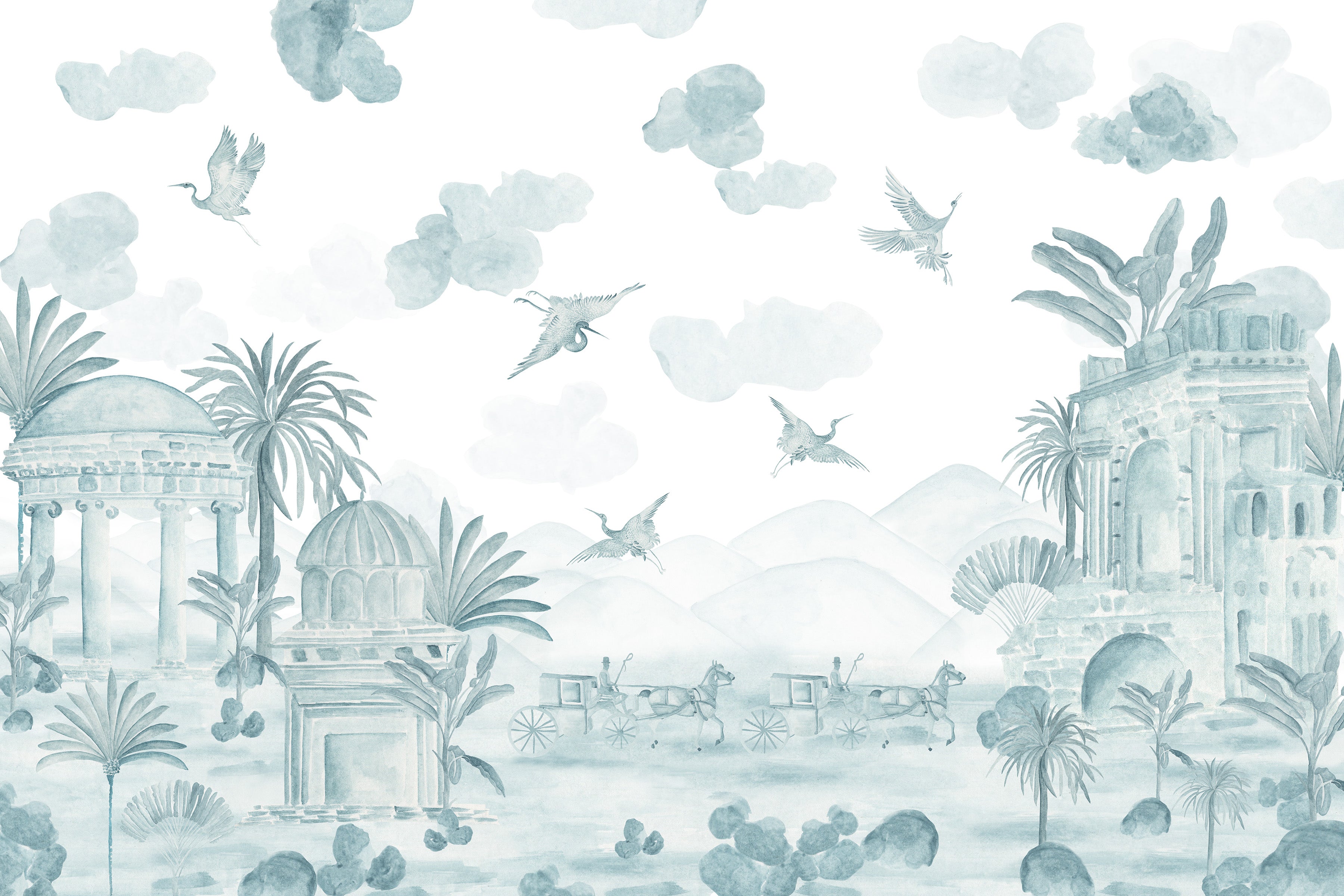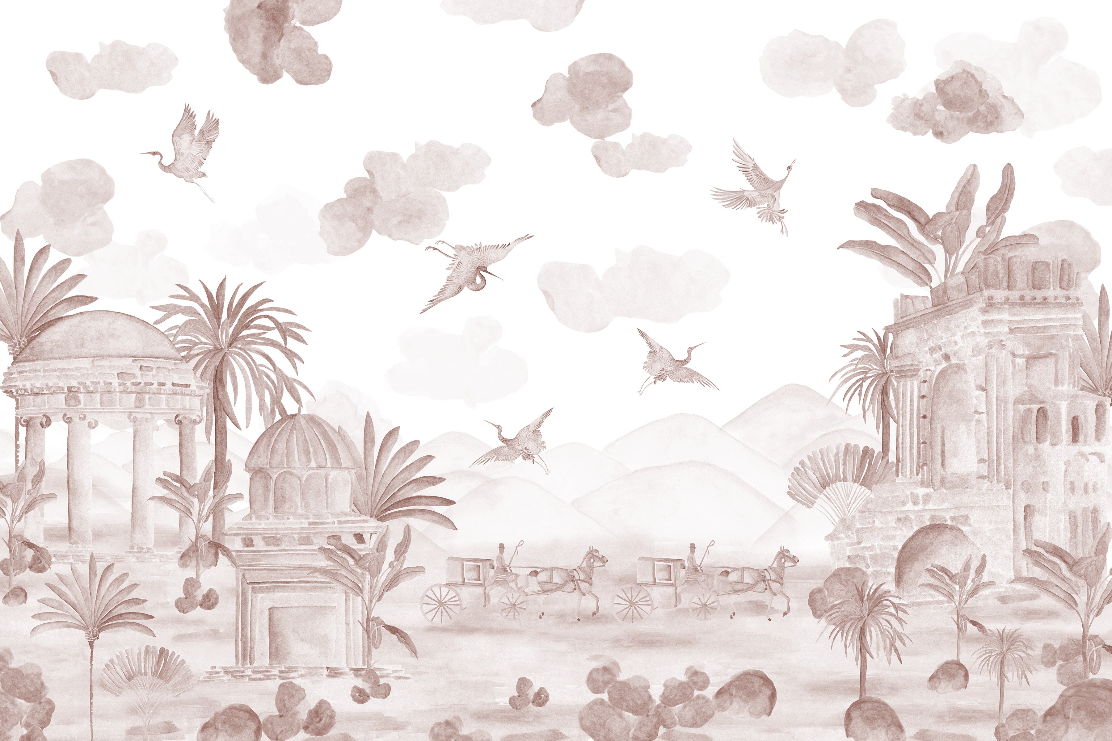 An expansive terrain stretches outward, defined by open skies, distant domes, and the quiet passage of horse-drawn carts. The composition is restrained and deliberate, allowing negative space and stillness to do the work of storytelling. Rather than depicting movement as urgency, the scene captures travel as contemplation. A moment suspended between departure and arrival.
