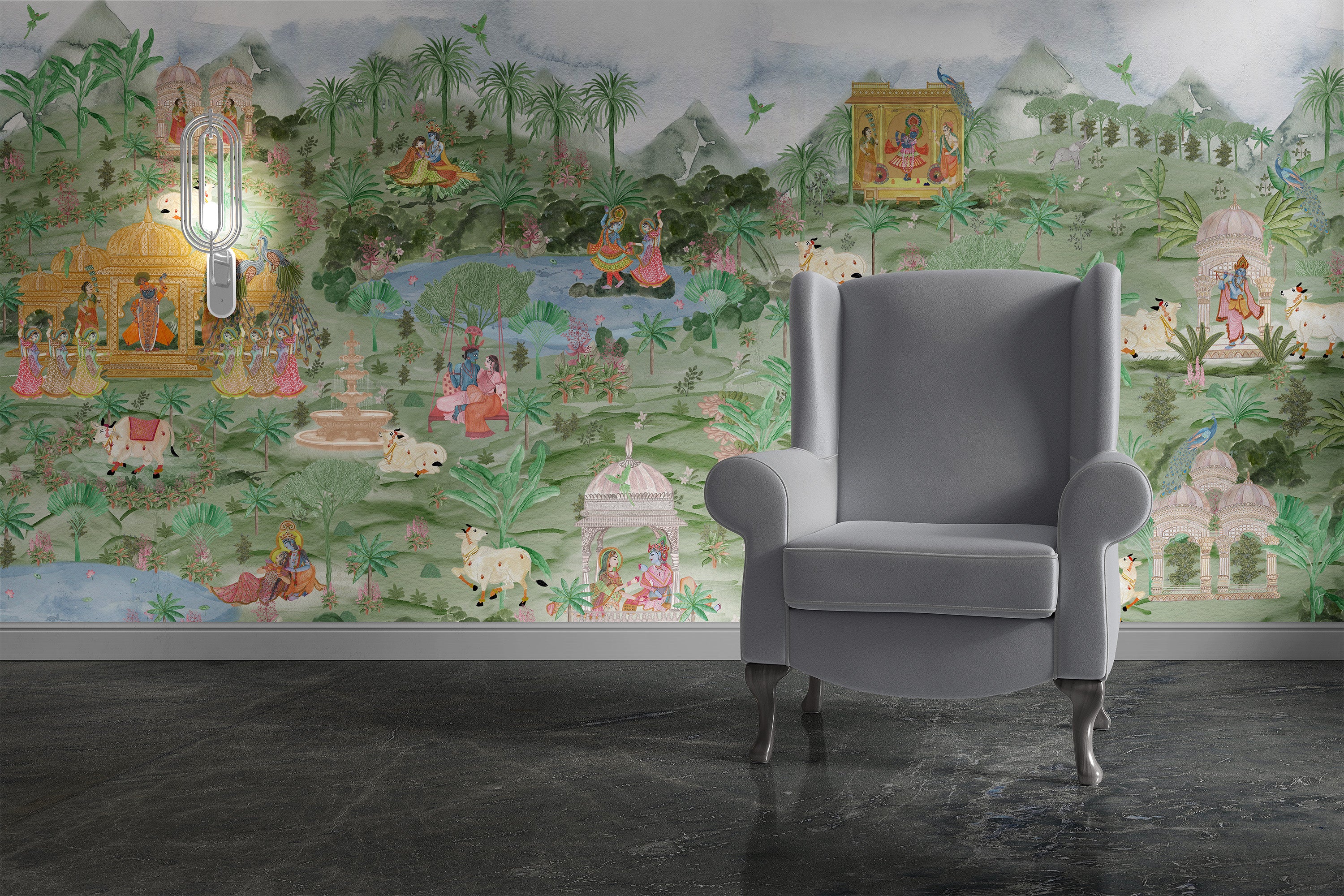 Celebrate the elegance of Pichwai, a centuries-old art form that originated in the temples of Nathdwara. Hand-painted elements of deities, lotus blooms and serene cows bring divine charm to your walls, capturing the essence of devotion and storytelling. Each brushstroke reflects intricate craftsmanship and timeless tradition, making this wallpaper a true masterpiece of sacred beauty and cultural heritage of imperial splendour to your space.